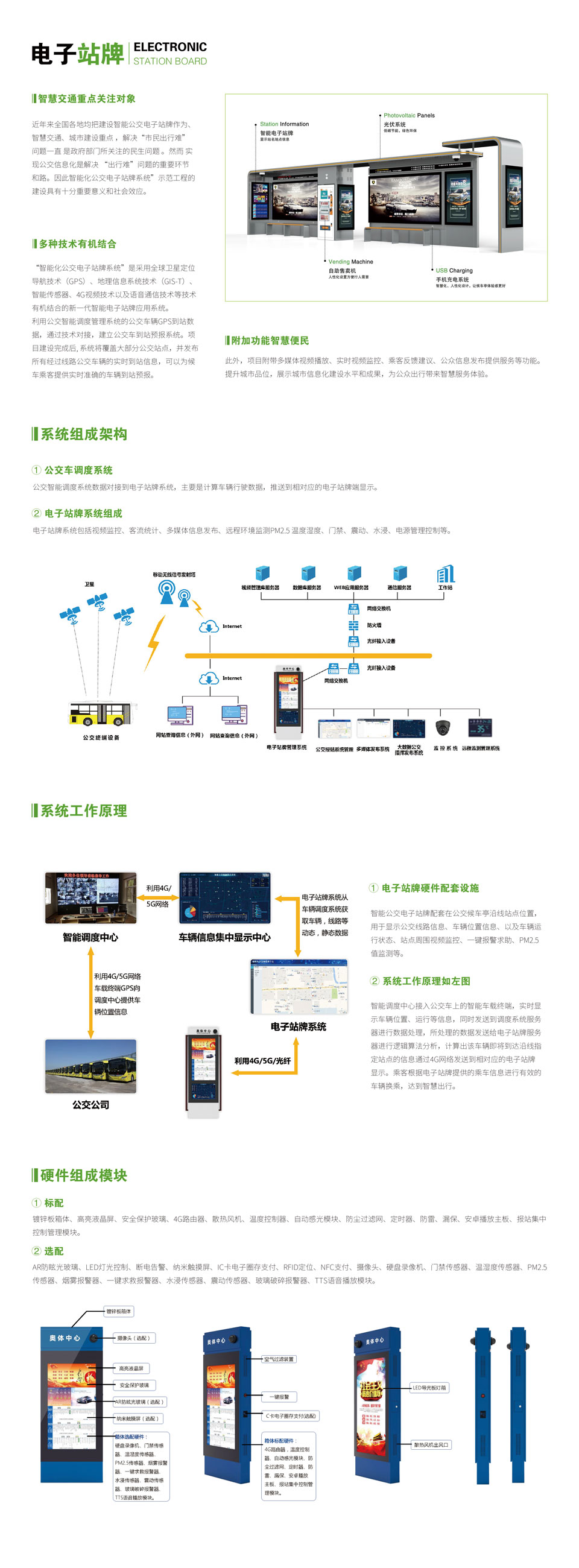 鍍鋅板箱體、高亮液晶屏、安全保護玻璃、4G路由器、散熱風機、溫度控制器、自動感光模塊、防塵過濾網、定時器、防雷、漏保、安卓播放主板、報站集中控制管理模塊。